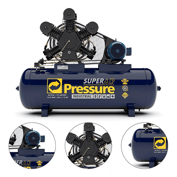 O Compressor de Ar Super Ar 60/425W da Pressure é uma máquina robusta e de alta performance, projetada para uso profissional pesado em indústrias, fábricas e grandes oficinas. Com uma potência impressionante de 15 HP, este compressor garante um suprimento contínuo e em alto volume de ar comprimido, ideal para alimentar múltiplas ferramentas pneumáticas, máquinas industriais, linhas de produção e serviços de jateamento e pintura profissional. Seu motor trifásico assegura uma operação confiável e potente para as tarefas mais exigentes.