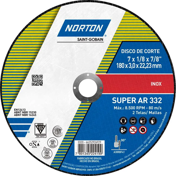 O Disco de Corte Norton Super AR332 180 × 3,0 × 22,23 mm é uma ferramenta de alto rendimento projetada especialmente para o corte preciso de aço inoxidável. Sua espessura de 3,0 mm e composição resistente oferecem excelente durabilidade e performance, tornando-o ideal para operações industriais exigentes.