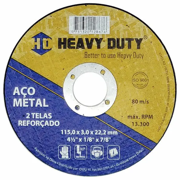 Ele possui diâmetro externo de 115 mm (~4½″) e furo central de 22,2 mm (7⁄8″), compatível com a maioria das esmerilhadeiras angulares portáteis. O disco também conta com duas telas de fibra de vidro para reforço, atendendo normas de segurança nacional e internacional como ABNT NBR 15230 / EN 12413.