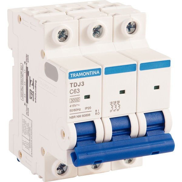 O Disjuntor Tripolar Tramontina TDJ3-3C63 é um dispositivo de segurança de alta capacidade, fundamental para a proteção de circuitos trifásicos pesados em quadros de distribuição principais ou painéis de força de médio porte.