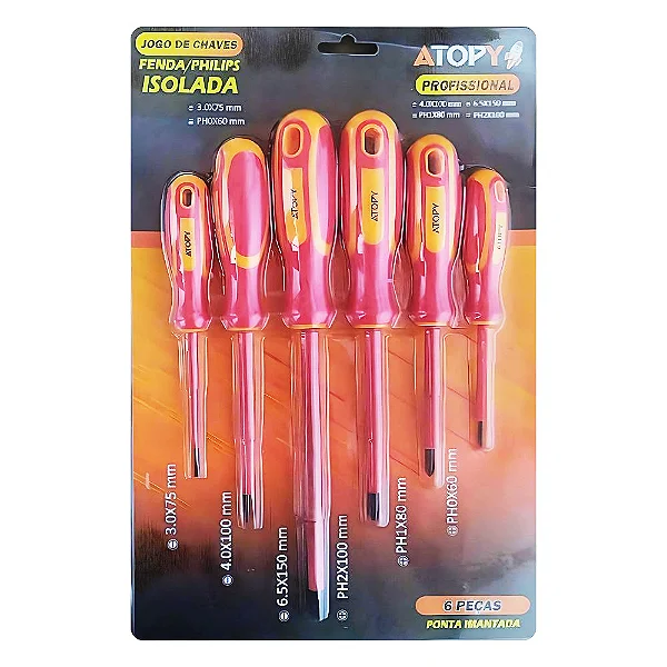 O Jogo de Chaves de Fenda e Phillips Atomy é a ferramenta essencial para eletricistas e profissionais que realizam trabalhos em redes energizadas. O kit, com 6 peças, garante segurança e precisão em cada tarefa. As chaves são isoladas, oferecendo proteção contra choques elétricos de até 1000V.