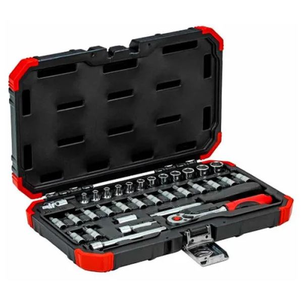 Todas as ferramentas são fabricadas em aço cromo-vanádio, garantindo alta resistência e durabilidade. O acabamento cromado acetinado não só proporciona um visual elegante, mas também protege contra a corrosão. O conjunto vem em uma maleta de plástico robusta com fechos de metal, projetada para manter as peças organizadas e seguras, facilitando o transporte e o acesso rápido.