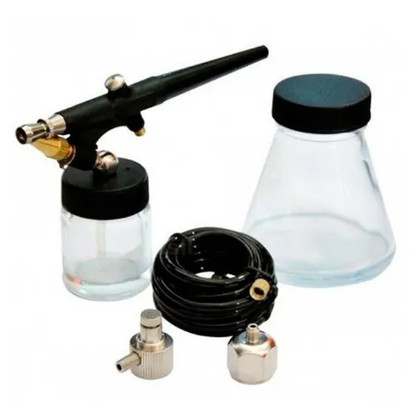 O kit reúne ferramentas que permitem operação imediata — aerógrafo, mangueira, reservatórios e adaptador — facilitando o uso com compressores domésticos ou de bancada. A construção em metal/cobre com componentes plásticos torna o conjunto leve, porém resistente para uso eventual e hobby.