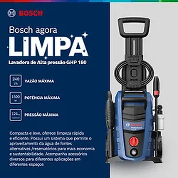 A Lavadora de Alta Pressão Bosch GHP 180 é uma solução portátil e potente para limpeza pesada, ideal para uso residencial intenso ou semiprofissional. Equipada com um motor de 1500 W, ela entrega uma pressão máxima de 1800 psi (aproximadamente 124,5 bar), garantindo a remoção eficaz de sujeira incrustada em veículos, pisos, muros e fachadas.