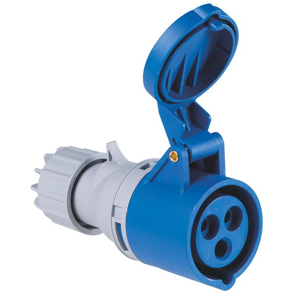 O design da tomada segue rigorosos padrões de segurança e compatibilidade, com a configuração 2P+T (2 polos e terra), que assegura uma conexão elétrica correta e livre de riscos. A peça é equipada com terminais de conexão que facilitam a instalação do cabeamento sem a necessidade de ferramentas complexas, economizando tempo e esforço. A cor azul e a posição do pino terra (6H) seguem as normas internacionais, o que simplifica a identificação da tensão e garante a compatibilidade com plugues de diferentes fabricantes.